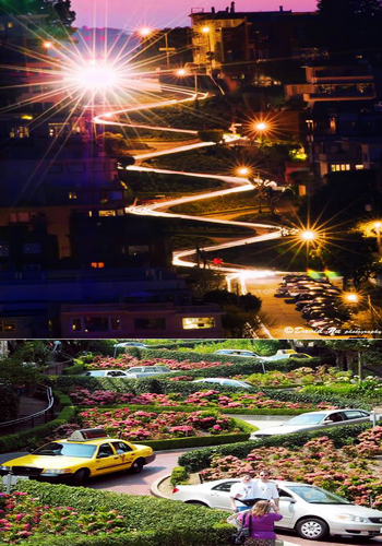 “九曲花街”位于美國(guó)加利福尼亞州,這一路段原是一個(gè)大下坡,這段坡度非常陡的街道原本是直線通行的,為了防止交通事故,特意添加了花壇設(shè)計(jì),車(chē)行至此,只能盤(pán)旋而下,時(shí)速不得超過(guò)5英里,這路段被改成了目前所見(jiàn)的彎曲迂回情況,利用長(zhǎng)度換取空間減緩沿線的坡度大小,地面鋪裝采用磚塊來(lái)增加摩擦力。這段街道因此有“世界上最彎曲的街道”之稱(chēng)。