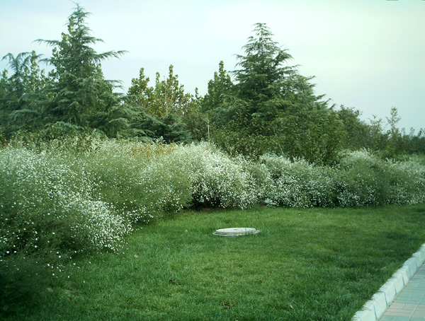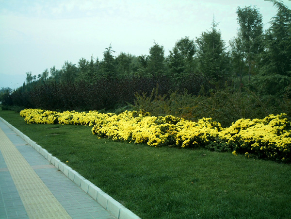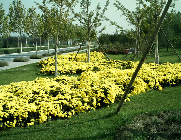 旱河路中間隔離帶以欒樹(shù)、檜柏作為骨干樹(shù)種,低矮植物采用波浪形色帶種植方式,用大葉黃楊、金葉女貞、紫薇三種不同色彩的植物搭配,突出夏季特點(diǎn),色彩艷麗,造型活潑。道路兩側(cè)30米綠帶內(nèi)主要以北京基調(diào)樹(shù)種和骨干樹(shù)種為主,并種植了幾十種高中檔喬灌木和彩葉樹(shù)種,植物品種豐富,層次鮮明,真正做到四季常綠,三季有花,季季有景可賞。
